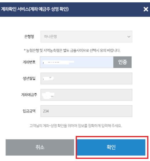 계좌번호 등을 누르면 인적사항이 자동으로 표출됩니다. 내 정보가 맞는지 최종적으로 확인하고 "확인"버튼을 누릅니다.