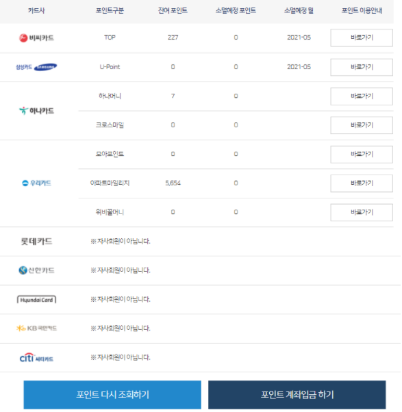 사실 포인트를 안 쓰는건 알지만 카드포인트 통합조회를 하니 한 눈에 들어와서 좋더라구요.
