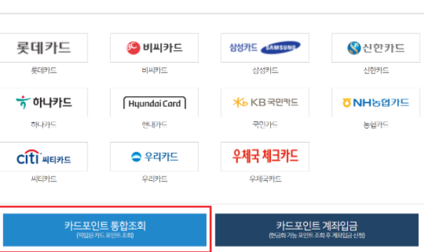 그 외는 개별 카드사에 조회하여 계좌입금을 신청하는 방법밖에 없습니다. 좌측 하단에 있는 "카드포인트 통합조회" 버튼을 눌러줍니다.