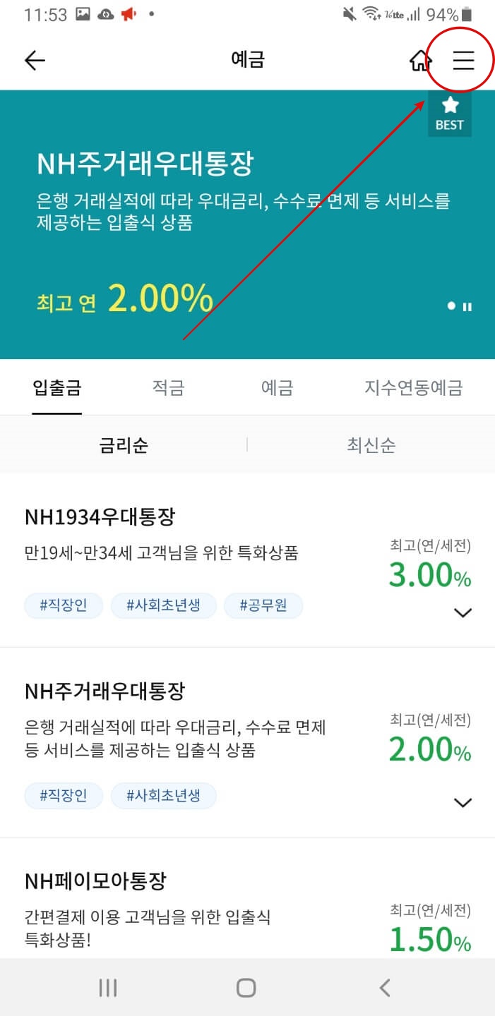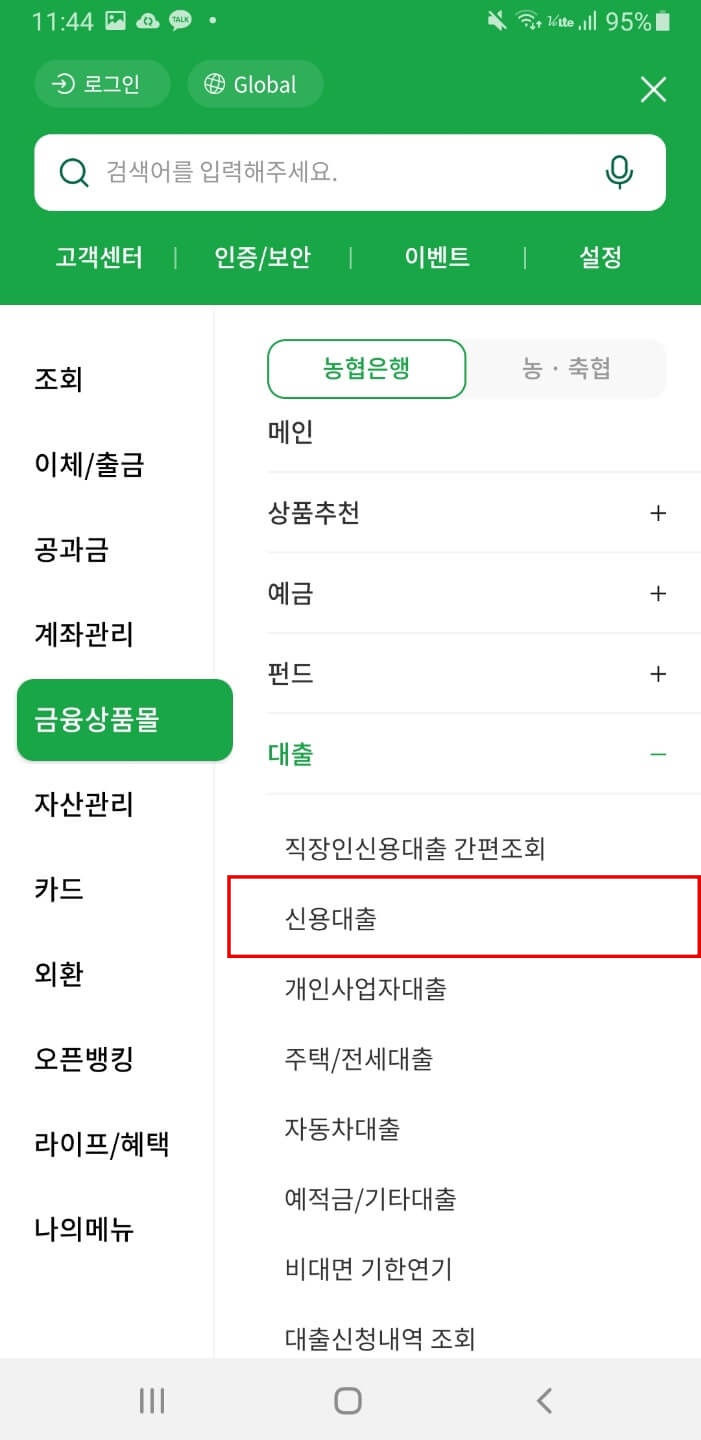 가입이 완료되셨다면 보이는 첫 페이지는 예금 관련 사항들일 겁니다. 오른쪽 상단의 더 보기 버튼을 눌러 대출 카테고리까지 볼 수 있도록 해 주세요. 그리고 난 후 금융상품몰로 이동 후 신용대출을 터치해 줍니다.